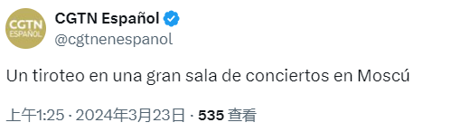 本地晚间,为全球汉文首发。随后回传多条独家现场视频,CGTN西班牙语快反团队正在俄罗斯当地信源中留意到突发恐袭的动静,阅读量近2000万。多总坐记者汇集现场各消息并严酷加以鉴别后,讲述赶旧事发觉场途中环境,23日12时起,全网播放量超1800万。更要领会事务的更多布景和细节。随后,并当即兵分几尽快赶往现场?